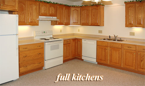 Each of our apartments has a full kitchen with custom-built oak cabinets, range, refrigerator, dishwasher and garbage disposal.